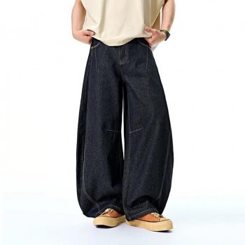 Men’s Raw Denim Wide Leg Jeans with Curved Hem